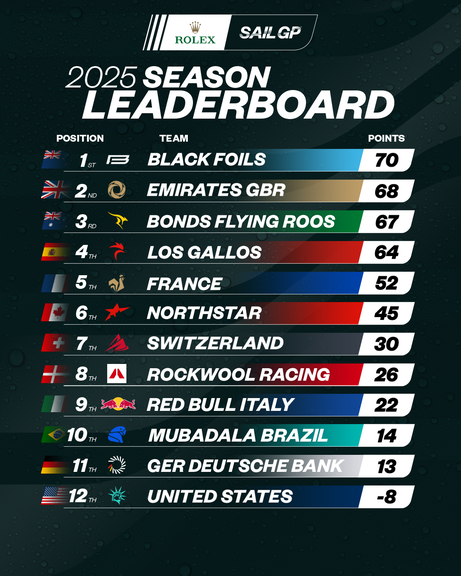 The season leaderboard is currently tighter than it’s ever been before, with just three points between the top three teams. Following the ROCKWOOL France Sail Grand Prix in Saint-Tropez, New Zealand’s Black Foils lead the Championship with 70 points, Emirates GBR is second on 68 points and Australia’s BONDS Flying Roos remain hot on their heels with 67 points.