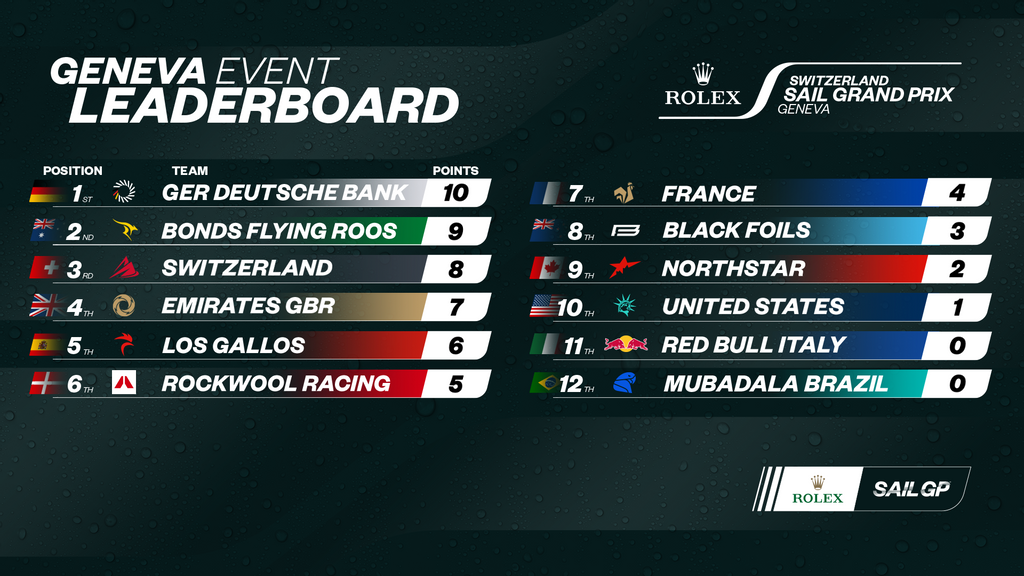 The second day of racing at the inaugural Rolex Sail Grand Prix in Geneva proved a frustrating one for Emirates GBR. The team finished tenth and seventh in the day’s two races. Despite the results, the team ended the event in fourth place and remains second in the season’s overall standings, firmly in the fight for the championship.