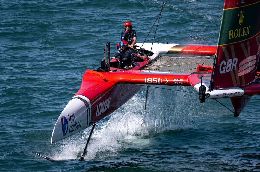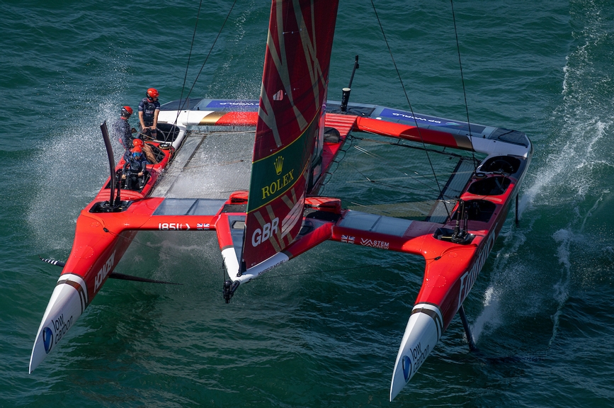 Emirates GBR Driver Dylan Fletcher said the team was “battling pretty hard” on the racecourse, after crew sizes were reduced from six people on-board to just four. This meant Strategist Hannah Mills had to jump on the grinding handles to provide the power to manoeuvre the F50’s wing – a role normally performed by burly duo Nick Hutton and Neil Hunter.